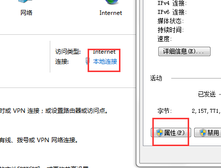 1、我们首先把鼠标放在电脑桌面右上角的电脑状图标上点击鼠标右键,然后在打开的小窗口中点击“打开网络和共享中心”,然后再在“打开网络和共享中心”界面中找到“本地连接”,鼠标左键点击,然后在打开的窗口中点击“属性”,如下图所示: